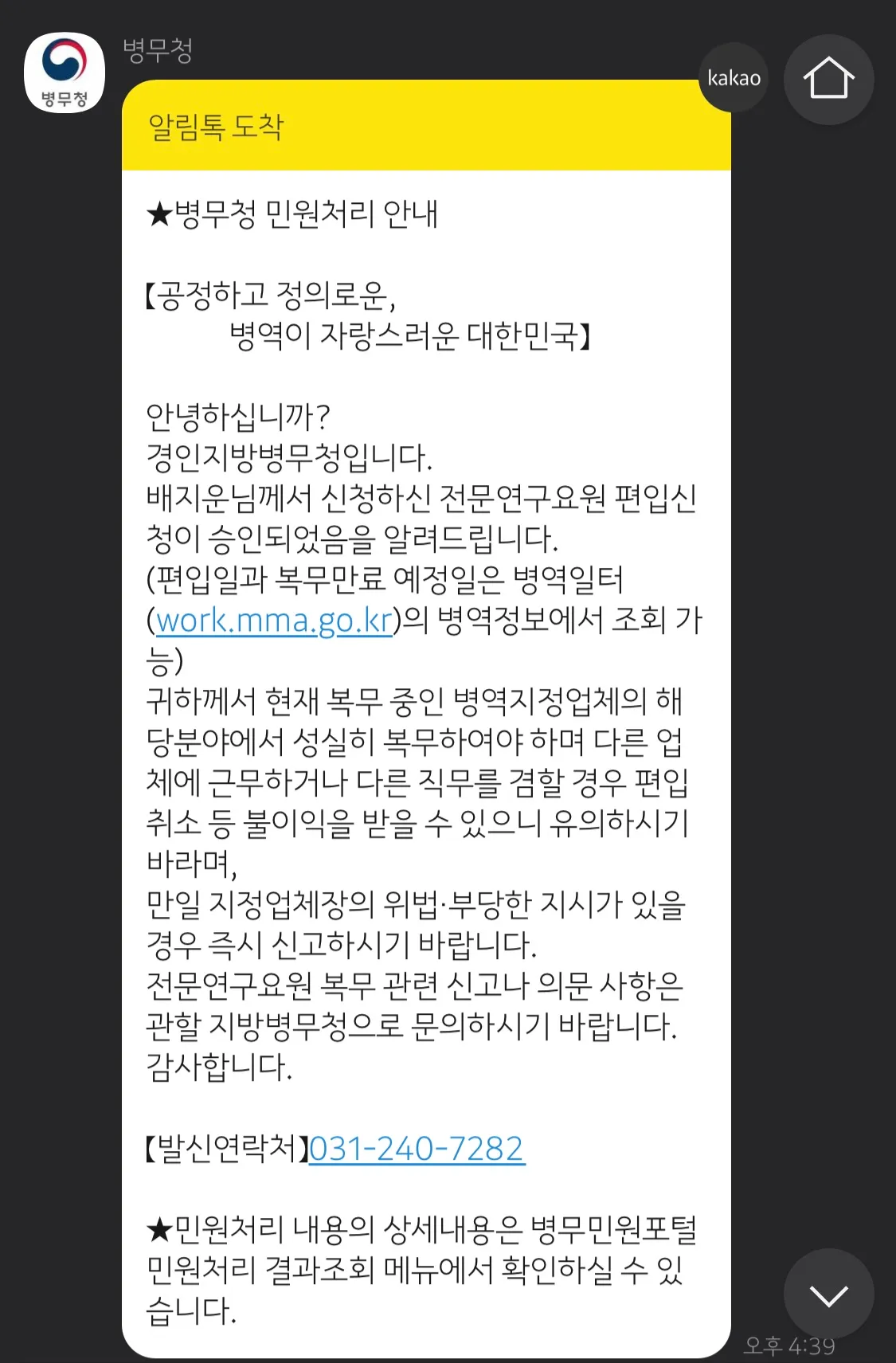 보통은 회사에 서류를 제출한 후 처리기간에 따라 2주 내로 병무청에 신청서를 접수하게 되고 편입이 완료되었다고 연락이 오게 됩니다.